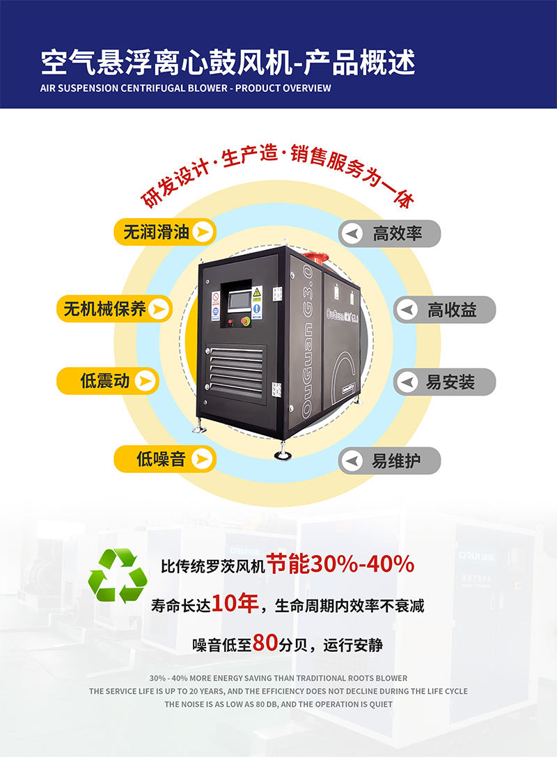無污染:無需潤滑,懸浮鼓風(fēng)機輸出的氣體潔凈無油,無污染